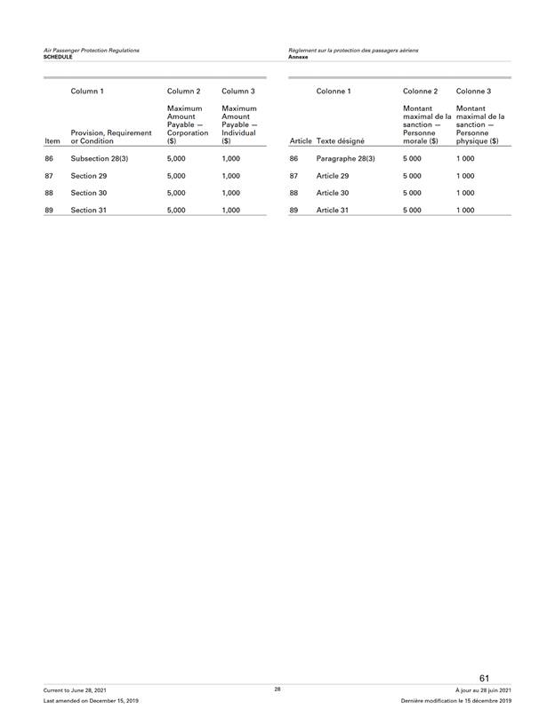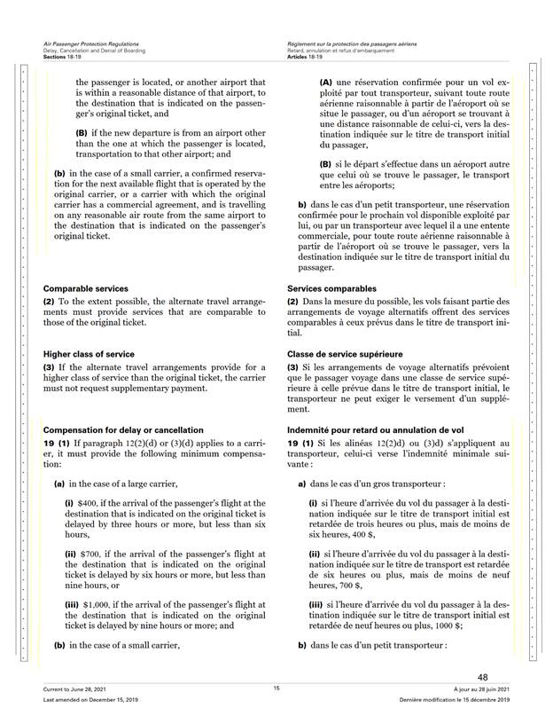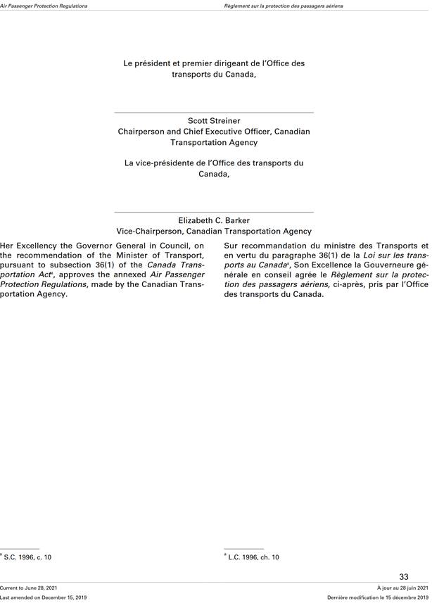 [12] The proposed Regulations were published in Part I of the Canada Gazette in December 2018, and approved by the Governor in Council on May 21, 2019. The Regulations modified the rights and obligations of passengers and air carriers, defining carriers’ minimum obligations to passengers with respect to: