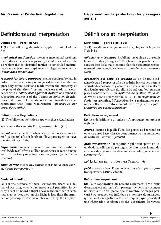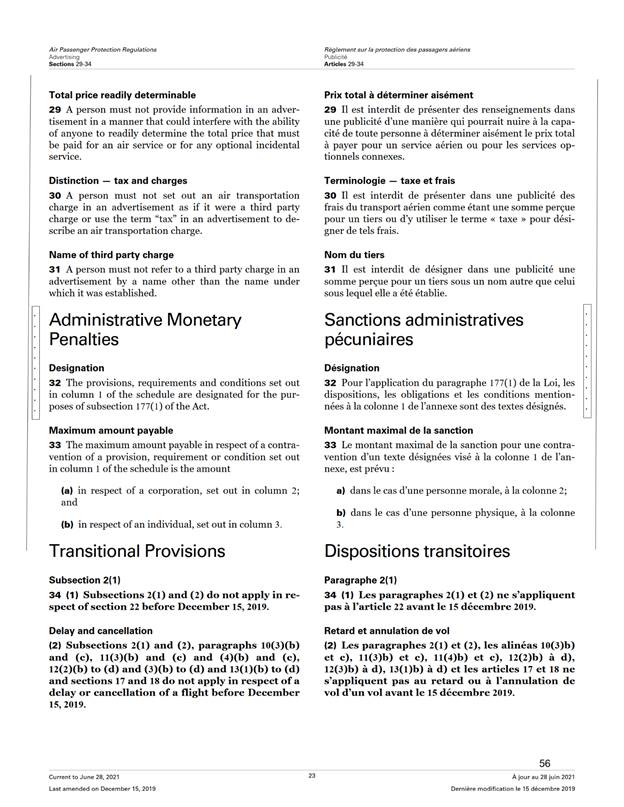 [3] Around the same time, the Agency adopted the Air Passenger Protection Regulations, S.O.R./2019-150 (the Regulations), imposing obligations – including liability – on air carriers with respect to tarmac delays, flight cancellations, flight delays, denial of boarding and damage or loss of baggage in the context of domestic and international air travel. For ease of reference, the text of the Regulations can be found in the Annex to these reasons.