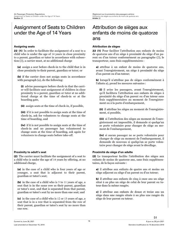 - the assignment of seats by foreign carriers on flights departing from airports outside of Canada (s. 22); and