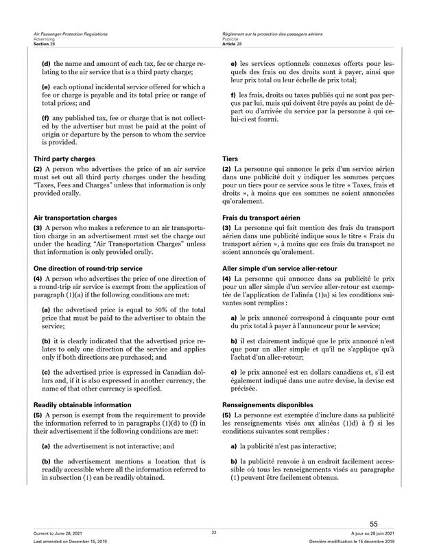[182] With the advent of the Regulations, it is not only the topics that carriers have to address in their terms and conditions that are set out but also the substance of their tariffs. In fact, many of the provisions impugned in this appeal cover topics that carriers were required to address in their international tariffs before the Regulations came into effect. The only difference is that the Agency no longer has to review individual carrier provisions for clarity or reasonableness if they reflect the Regulations. Carriers were, and continue to be, subject to section 116 of the Air Transportation Regulations, which requires them to keep their tariff at each business office and to prominently display a sign indicating that the tariff is available for public inspection. They were and continue to be subject to section 116.1 of the Air Transportation Regulations, which requires carriers selling or offering international services on their website to display their tariff on that site and prominently post a notice to that effect. The Agency also continues to have jurisdiction to review complaints that carriers are not applying the terms and conditions contained in their tariff, and to order corrective measures (including compensation) if that is the case. In short, nothing has changed with respect to the jurisdiction of the Agency to review the terms and conditions of carriage set out in tariffs for international services provided by both Canadian and non-Canadian carriers. The only difference is that the terms and conditions on many topics are now set out by the Regulations, instead of being left to each carrier.