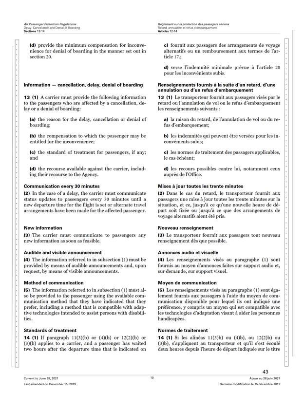 [14] With respect to flight delays, cancellations and denied boarding, the Regulations establish informational (s. 13) and assistance (ss. 14, 16) obligations, require carriers to provide alternate travel arrangements and, in certain circumstances, refund a ticket or an unused portion of it. Additionally, the Regulations imposed a standardized minimum compensation amount for passengers who experienced flight delays, cancellations or denial of boarding that was “within the carrier’s control”
