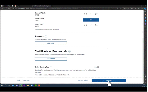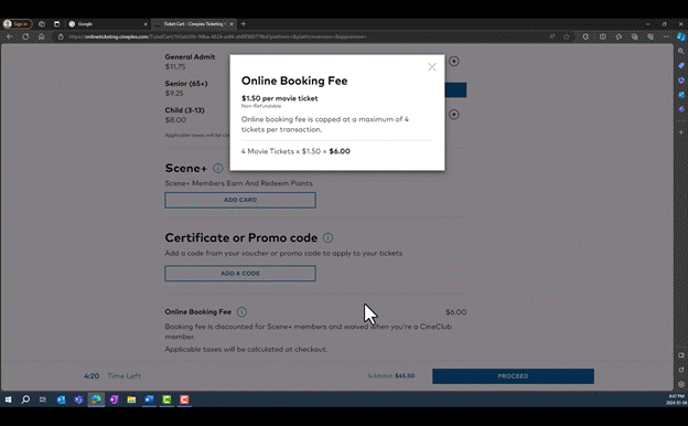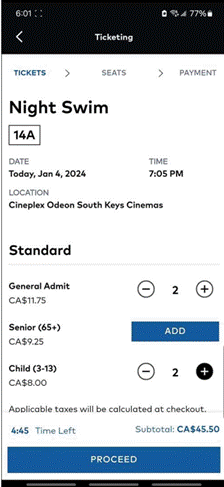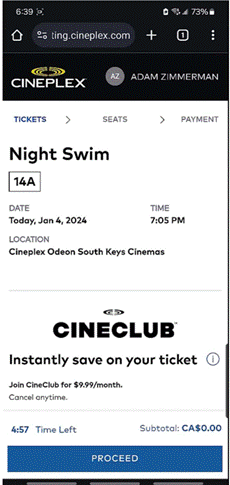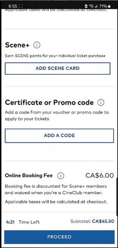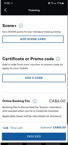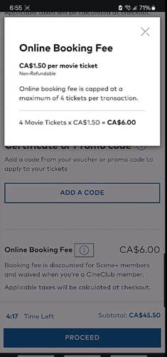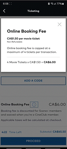 [10] On June 15, 2022, Cineplex implemented an Online Booking Fee as a service fee that applies only to tickets purchased on Cineplex’s website or app. Generally, the fee was fixed at $1.50 per ticket, to a maximum of four tickets, with no fee being payable for additional tickets if more than four tickets are purchased in one transaction. In addition, no fee is charged for members of Cineplex’s CineClub, which is Cineplex’s movie subscription program, and members of the Scene+ loyalty program are charged a reduced Online Booking Fee of $1.00 per ticket.